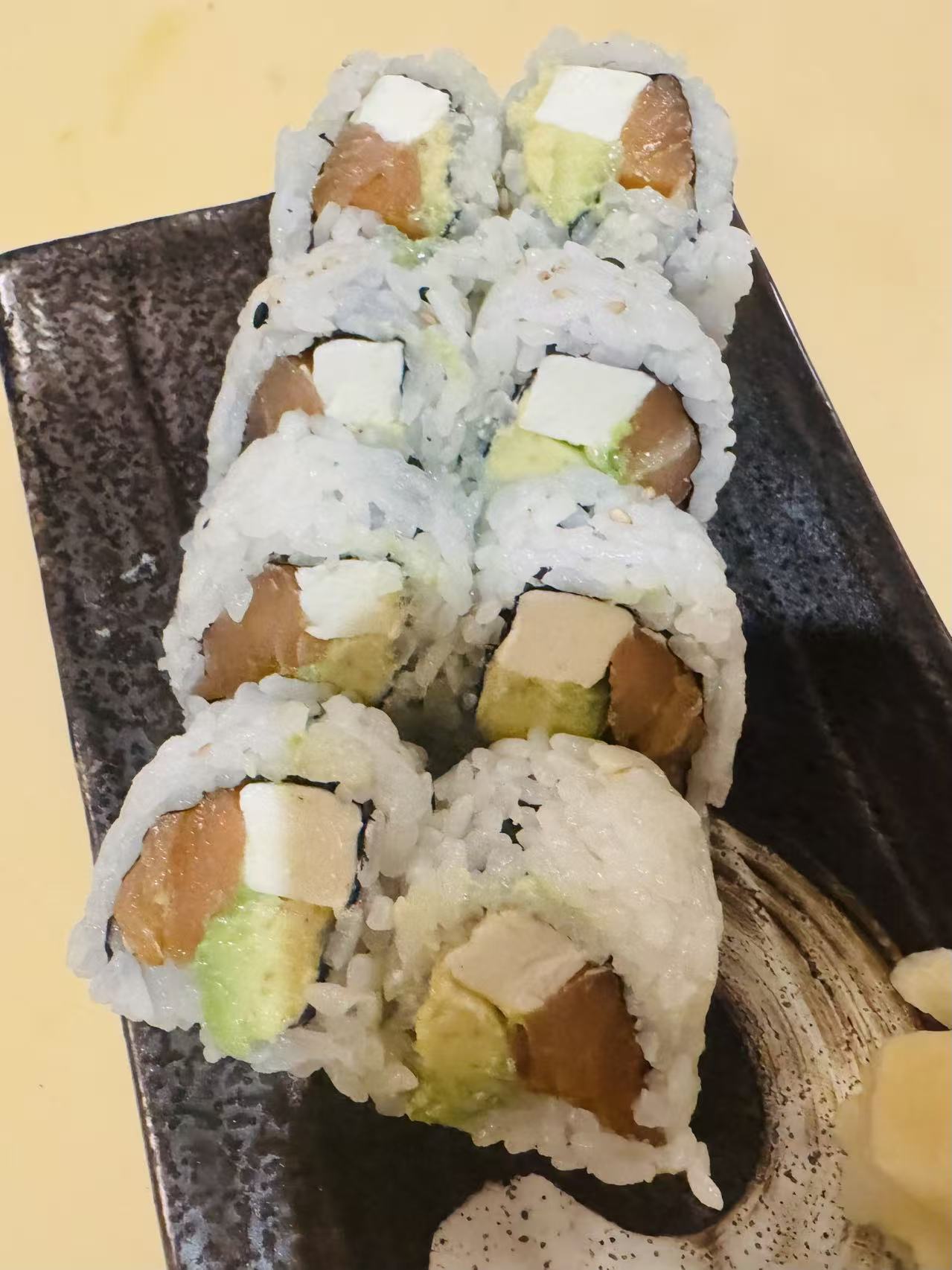 Inside:Crabmeat,avocado & cream cheese Top:Baked spicy salmon,spicy mayo
