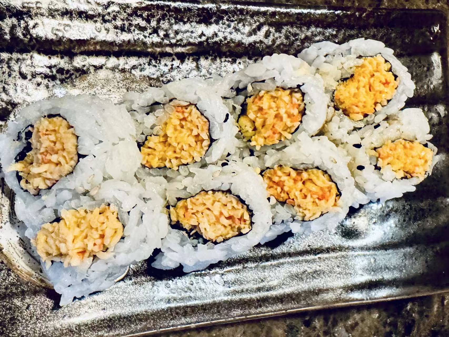 Inside: california roll, crunch Top: spicy crabmeat, scallop, scallion