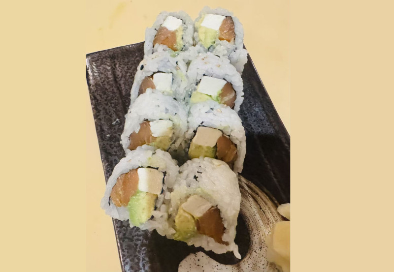 Inside: Salmon, cream cheese, avocado Top: crabmeat, eel sauce