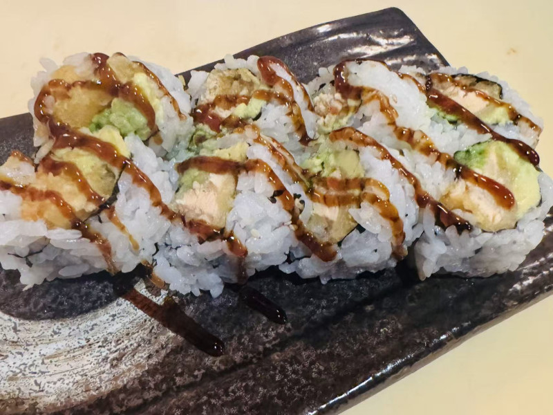 Inside: fried tuna, cream cheese Top: avocado, honey wasabi sauce, eel sauce
