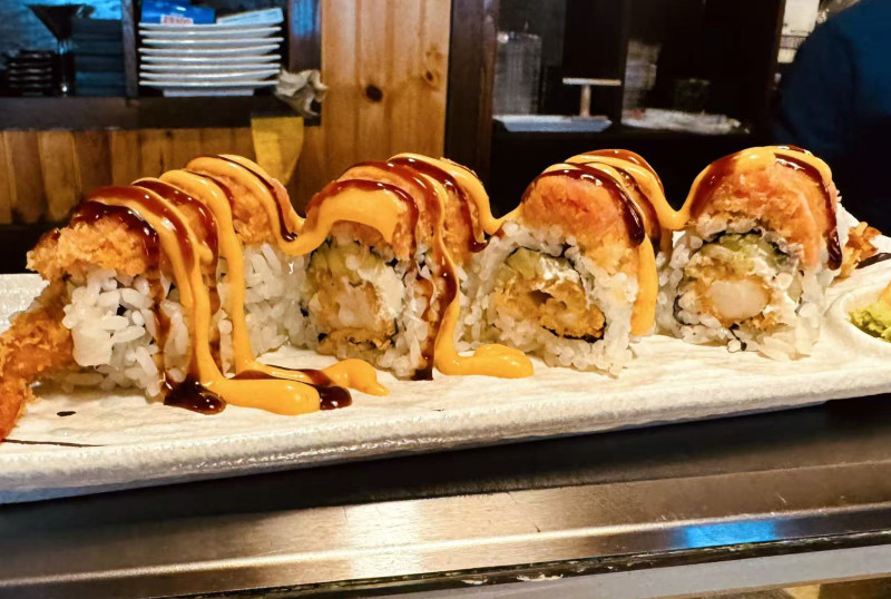 Tempura shrimp and cream cheese, crab & avocado deep fried with spicy mayo sauce & eel sauce